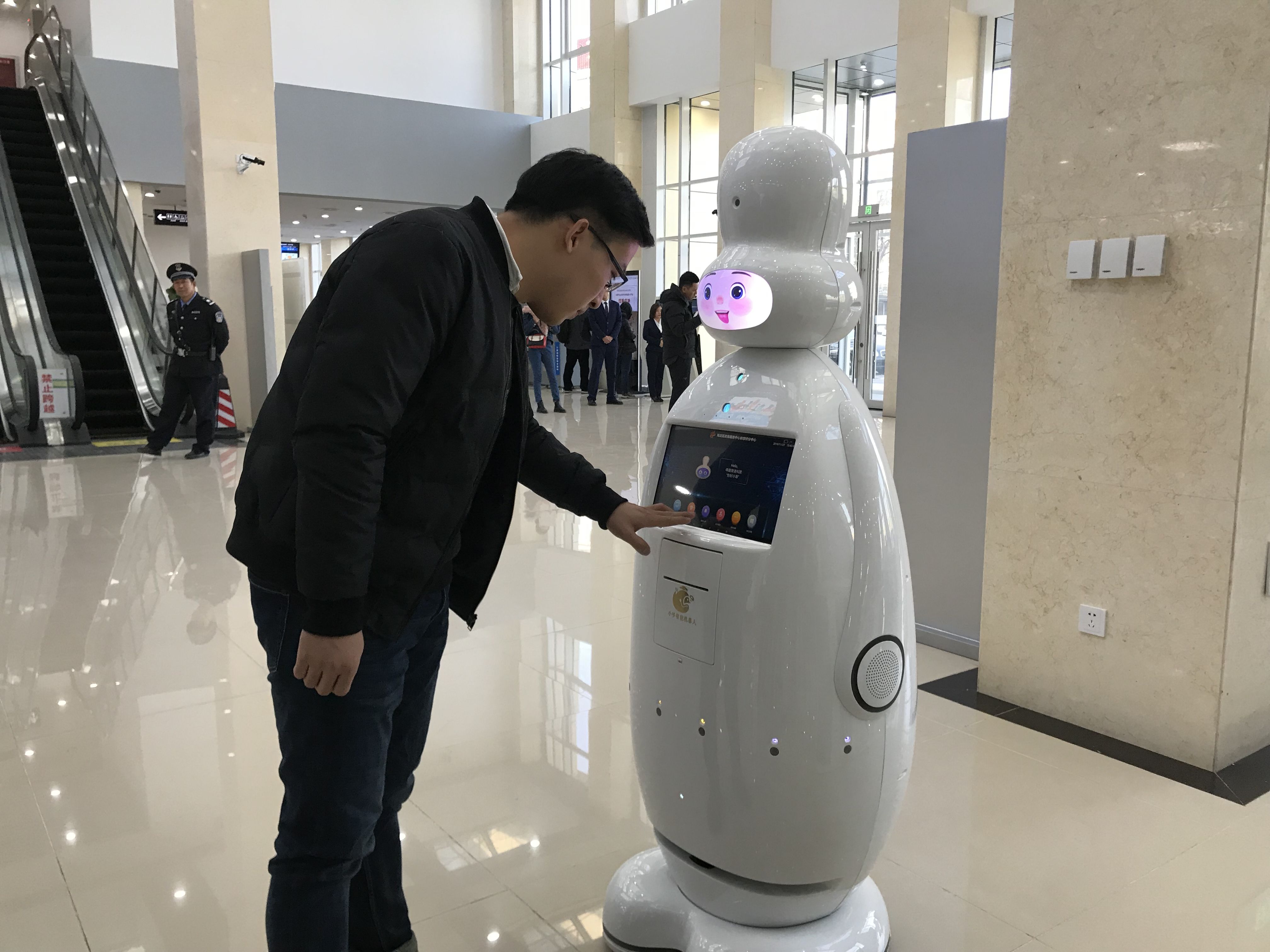 新政務(wù)服務(wù)大廳設(shè)置的可移動(dòng)機(jī)器人。攝/新京報(bào)記者 陳琳