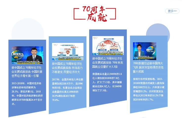 4.新中國成立70周年發(fā)展成就宣傳有聲有色。一是發(fā)布70周年經(jīng)濟(jì)社會(huì)發(fā)展成就系列報(bào)告23篇,并通過各大媒體廣泛宣傳報(bào)道。多篇報(bào)告內(nèi)容在央視黃金時(shí)間播出,中國政府網(wǎng)、人民網(wǎng)、學(xué)習(xí)強(qiáng)國等各大媒體和平臺(tái)轉(zhuǎn)載并開發(fā)利用。二是國家統(tǒng)計(jì)局領(lǐng)導(dǎo)接受央視、央廣、澎湃新聞等媒體專訪,介紹新中國成立70年來發(fā)展成就。三是編印大型書籍《輝煌70年—新中國經(jīng)濟(jì)社會(huì)發(fā)展成就(1949—2019)》,運(yùn)用豐富翔實(shí)的資料、數(shù)據(jù)和圖表,從統(tǒng)計(jì)視角系統(tǒng)展現(xiàn)新中國成立70年來經(jīng)濟(jì)社會(huì)發(fā)展的輝煌成就。四是充分挖掘統(tǒng)計(jì)資源,積極參與“新中國成立70周年”大型展覽制作和央視、光明日?qǐng)?bào)、人民網(wǎng)等中央媒體“新中國70年”重要節(jié)目制作等。五是開發(fā)系列新媒體產(chǎn)品,制作反映工業(yè)發(fā)展巨變、人民生活變遷、消費(fèi)市場(chǎng)欣欣向榮、服務(wù)業(yè)不斷壯大和農(nóng)業(yè)農(nóng)村事業(yè)扎實(shí)推進(jìn)等內(nèi)容的視頻和圖解等產(chǎn)品,新穎地展現(xiàn)新中國70年來發(fā)展成就。