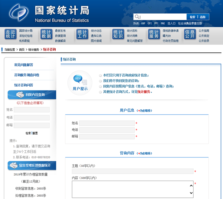 2.暢通統(tǒng)計(jì)咨詢服務(wù)渠道。一是提供多渠道服務(wù)方式,便利公眾獲取統(tǒng)計(jì)信息并提出意見建議。2019年,國家統(tǒng)計(jì)局通過電話咨詢、網(wǎng)站“統(tǒng)計(jì)咨詢”欄目、電子郵箱、“局長信箱”、新媒體平臺(tái)“互動(dòng)”等渠道,共為社會(huì)各界提供統(tǒng)計(jì)信息咨詢服務(wù)14152人次。二是完善公眾自助查詢服務(wù)內(nèi)容。在統(tǒng)計(jì)咨詢欄目增加“統(tǒng)計(jì)咨詢問答”,方便公眾自行查找統(tǒng)計(jì)數(shù)據(jù)。根據(jù)最新社會(huì)經(jīng)濟(jì)數(shù)據(jù),及時(shí)更新補(bǔ)充電話自助語音播報(bào)系統(tǒng)和網(wǎng)站“常見問題解答”欄目內(nèi)容,幫助公眾獲取統(tǒng)計(jì)資料和了解統(tǒng)計(jì)知識(shí)。三是通過國家統(tǒng)計(jì)局網(wǎng)站發(fā)布統(tǒng)計(jì)咨詢服務(wù)調(diào)查問卷,及時(shí)了解公眾對(duì)數(shù)據(jù)發(fā)布、統(tǒng)計(jì)服務(wù)的滿意度和意見建議,不斷提升服務(wù)針對(duì)性和有效性。