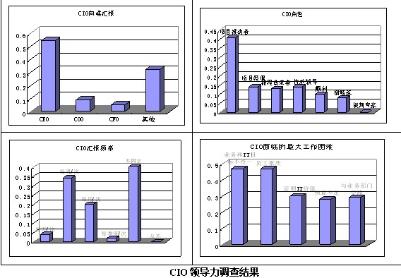 《信息周刊》最近對中國CIO領(lǐng)導(dǎo)力進(jìn)行了調(diào)查,調(diào)查結(jié)果顯示:45%的中國CIO直接向總裁或CEO匯報(bào)工作,而其他CIO向COO、CFO或者其他高級經(jīng)理層匯報(bào);只有8%的CIO在組織中扮演著組織戰(zhàn)略家的角色,大多(41%)CIO還只是扮演著項(xiàng)目推動(dòng)者的角色;只有38%的CIO至少每周向直接主管匯報(bào),而多達(dá)40%的CIO沒有固定時(shí)間向主管匯報(bào);將近一半(47%)的CIO任務(wù)自己最大的困難是業(yè)務(wù)目標(biāo)和IT項(xiàng)目間缺乏統(tǒng)一性和員工素質(zhì)和能力有待提高。(信息周刊 2006)