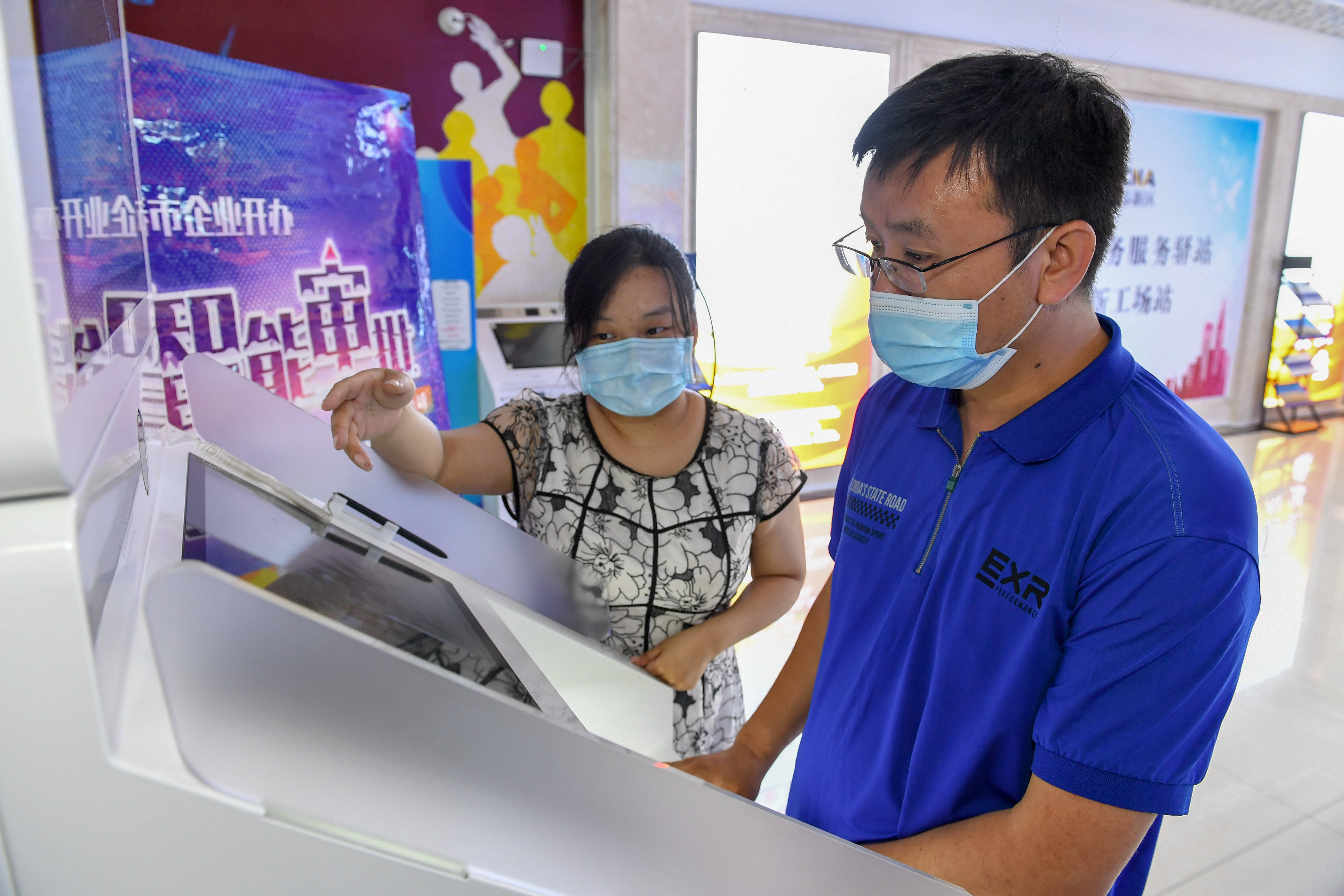 6月16日,在長春新區(qū)政務(wù)服務(wù)驛站擺渡創(chuàng)新工場站,某企業(yè)負(fù)責(zé)人(右)在工作人員的協(xié)助下,使用自助服務(wù)終端機(jī)辦理審批業(yè)務(wù)。