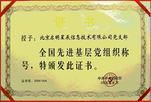 2006年6月30日,中共中央組織部在中南海懷仁堂隆重召開紀念建黨85周年暨保持共產(chǎn)黨員先進性教育活動總結(jié)大會,會上對500個全國先進基層黨組織、50名全國優(yōu)秀共產(chǎn)黨員、200名全國優(yōu)秀黨務工作者進行了表彰。北京啟明星辰信息技術(shù)有限公司黨支部,榮獲“全國先進基層黨組織”稱號,成為海淀園企業(yè)中首家獲得此榮譽的單位,更是非公高科技企業(yè)黨支部所獲得的最高殊榮。
