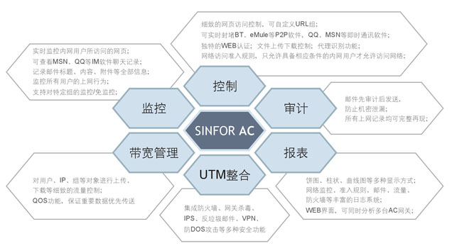 SINFOR M5X000-AC上網(wǎng)行為管理設(shè)備是國(guó)內(nèi)領(lǐng)先的內(nèi)網(wǎng)安全整體解決方案。在內(nèi)部安全的上網(wǎng)行為管理(網(wǎng)絡(luò)安全審計(jì))上,為防止員工在工作時(shí)間濫用互聯(lián)網(wǎng),SINFOR AC提供了強(qiáng)大的網(wǎng)絡(luò)控制和監(jiān)控功能,有效提高了員工的工作效率和企業(yè)的生產(chǎn)力。