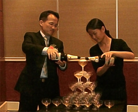 游龍科技總裁張澤軍和IDG的投資伙伴李瑩共同倒香檳塔慶祝