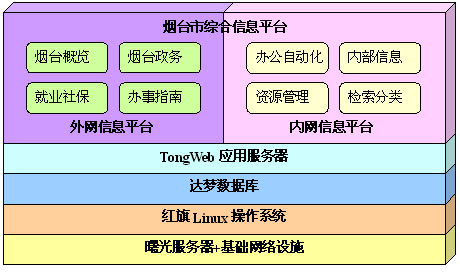 煙臺市綜合信息平臺作為煙臺市電子政務(wù)應(yīng)用系統(tǒng)建設(shè)的重要組成部分,分為外網(wǎng)和內(nèi)網(wǎng)二大信息平臺。外網(wǎng)平臺包括建設(shè)煙臺綜合信息網(wǎng)站、政府有關(guān)部門信息網(wǎng)站。內(nèi)網(wǎng)平臺包括政府及其部門辦公自動化網(wǎng)、內(nèi)部信息網(wǎng)和信息資源庫。建立統(tǒng)一的基于B/S結(jié)構(gòu)的綜合信息平臺,將現(xiàn)有部門信息分層次錄入、檢索、分類、管理。