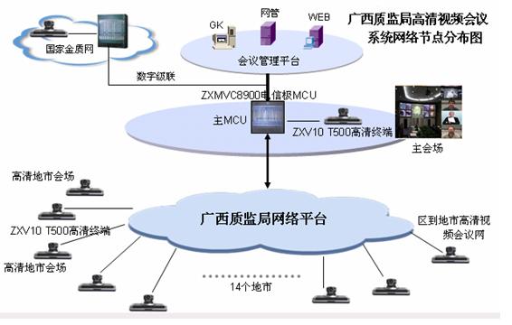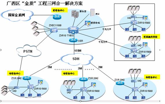 憑借全面的融合通信產(chǎn)品和解決方案、豐富的電子政務(wù)工程建設(shè)和實(shí)施經(jīng)驗(yàn),中興通訊為廣西“金質(zhì)工程”(一期)系統(tǒng)“量身定做”出一整套基于IP融合、使用方便靈活的解決方案:將整個系統(tǒng)分為兩個部分,即區(qū)質(zhì)監(jiān)局一級節(jié)點(diǎn)信息中心、各地市質(zhì)監(jiān)局及相關(guān)研究機(jī)構(gòu)共計(jì)15個二級節(jié)點(diǎn)信息中心,在管理上體現(xiàn)垂直的系統(tǒng)架構(gòu)。整個網(wǎng)絡(luò)可以看作一個分級的星形網(wǎng)絡(luò),結(jié)構(gòu)簡單、易于擴(kuò)展。