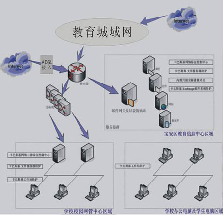 基于發(fā)展和網(wǎng)絡(luò)安全建設(shè)的考慮,深圳市寶安區(qū)教育城域網(wǎng)網(wǎng)絡(luò)防病毒二期工程決定從終端病毒的防范開始,建立一套反病毒解決方案。經(jīng)過了多次的對比選擇和產(chǎn)品試用后,深圳市寶安區(qū)教育城域網(wǎng)網(wǎng)絡(luò)防病毒二期工程最終將目光鎖定在了卡巴斯基開放空間安全解決方案上。
