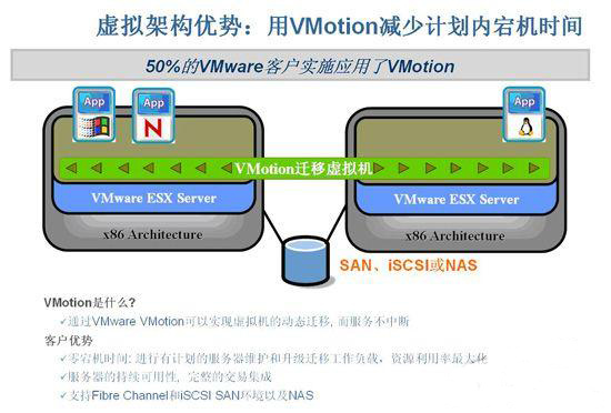 特別需要強調(diào)的是,VMware產(chǎn)品還具有一虛擬機實時遷移能力——VMotion技術(shù),VMotion采用內(nèi)存后臺備份的機制,可以實現(xiàn)在線遷移,也就是說,幾乎沒有停機時間。