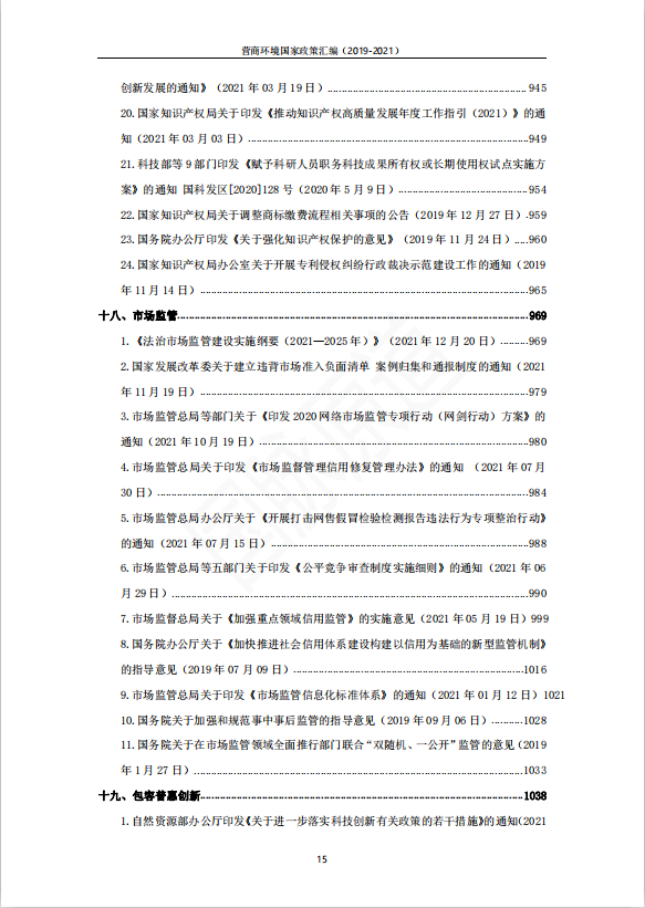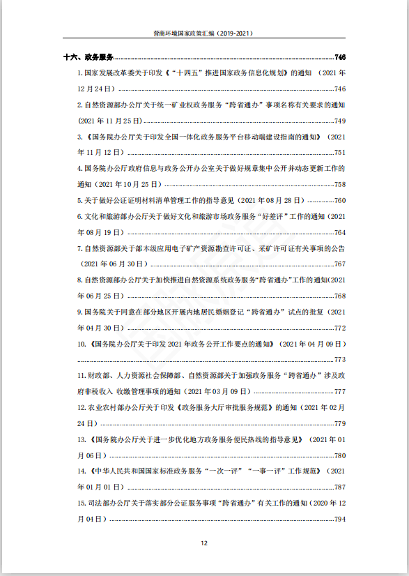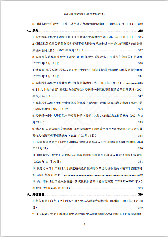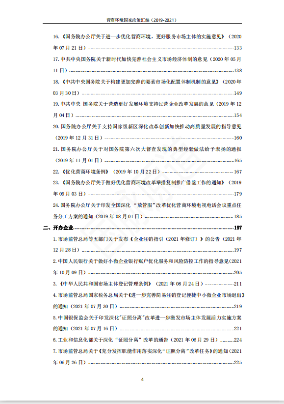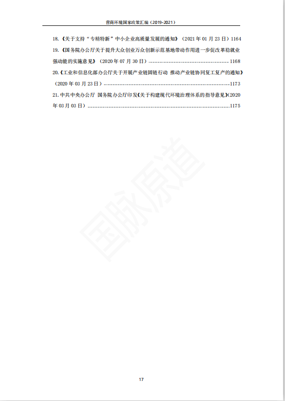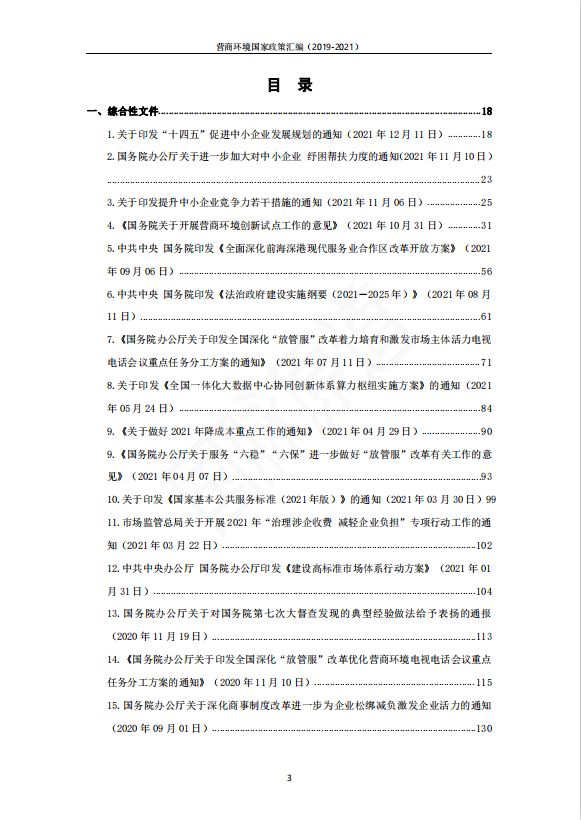 近年來,黨中央、國務院圍繞市場主體需求,以深化“放管服”為主要抓手,出臺了一系列政策文件,指引我國營商環(huán)境優(yōu)化工作的有序、有力開展。湖南國脈原道數(shù)據(jù)科技有限公司對國家層面2019年-2021年出臺的營商環(huán)境相關(guān)的政策文件、標準規(guī)范等進行了匯編,按照國家發(fā)改委營商環(huán)境評價的18大指標進行了分類整理,共計200余個文件。該匯編將持續(xù)性更新,是各地各部門優(yōu)化營商環(huán)境工作開展的重要參考。