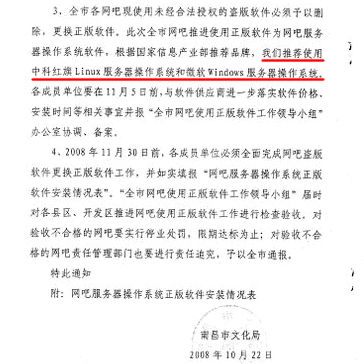 12月4日消息,有國外媒體報道稱,江西南昌市要求全市網(wǎng)吧服務(wù)器操作系統(tǒng)全部使用正版軟件,強制網(wǎng)吧業(yè)主安裝中國本土Linux廠商中科紅旗產(chǎn)品,而安裝紅旗Linux服務(wù)器操作系統(tǒng)需要支付一筆5000元的費用。對此,南昌文化局和中科紅旗均予以否認,但二者確實有合作協(xié)議。