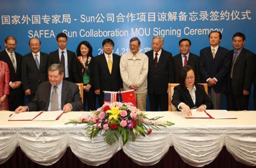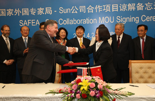 2009年4月21日,Sun Microsystems全球執(zhí)行副總裁兼亞太區(qū)主席Crawford Beveridge先生與中國國家外國專家局(SAFEA)副局長李兵女士代表雙方簽署《面向高校管理者與骨干教師、IT人才,進(jìn)行素質(zhì)提升與能力建設(shè)》合作備忘錄,以支持中國國家人才培養(yǎng)計劃,通過開源技術(shù)的力量,促進(jìn)高校管理者、骨干教師與IT人才、未來技術(shù)專家的素質(zhì)提升與能力建設(shè)。