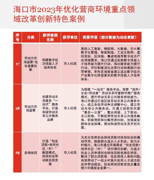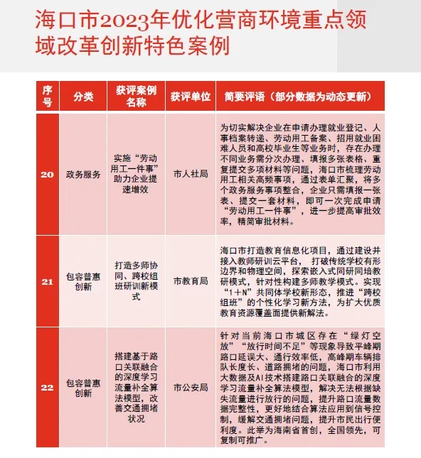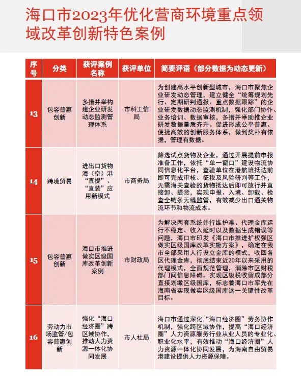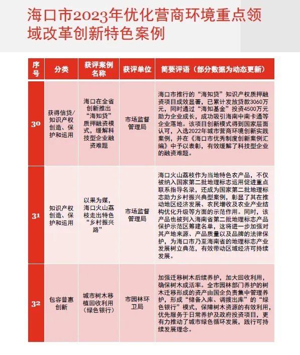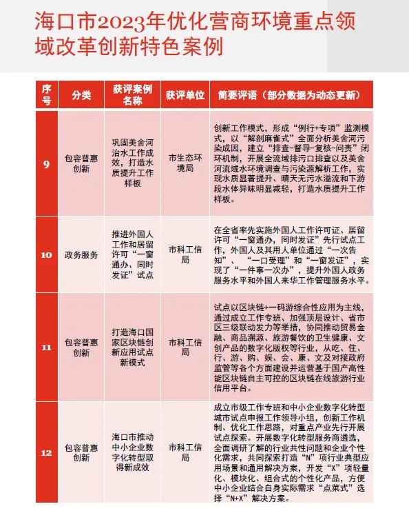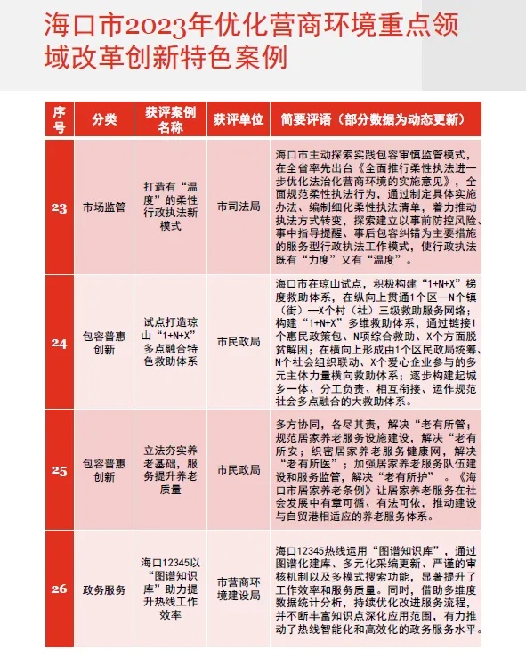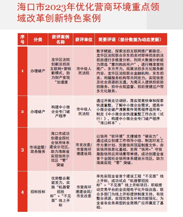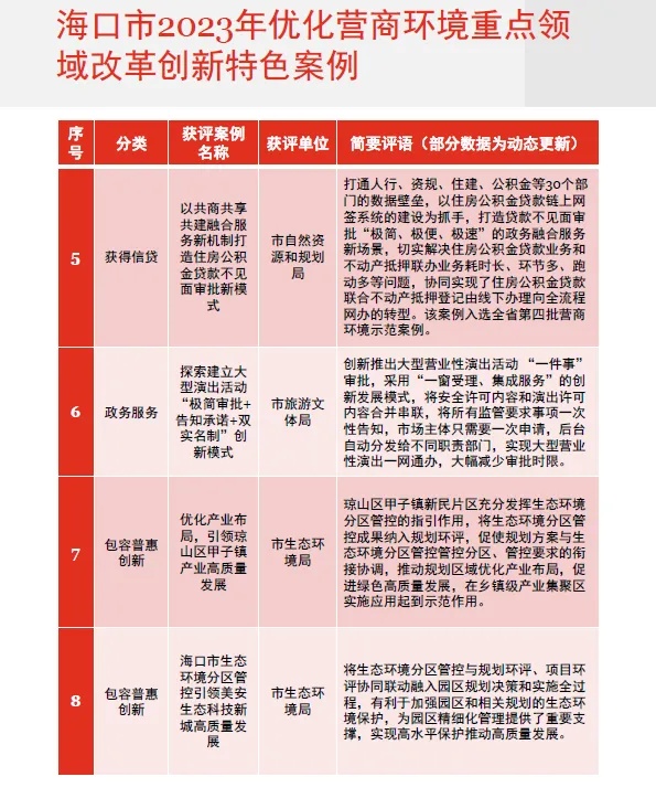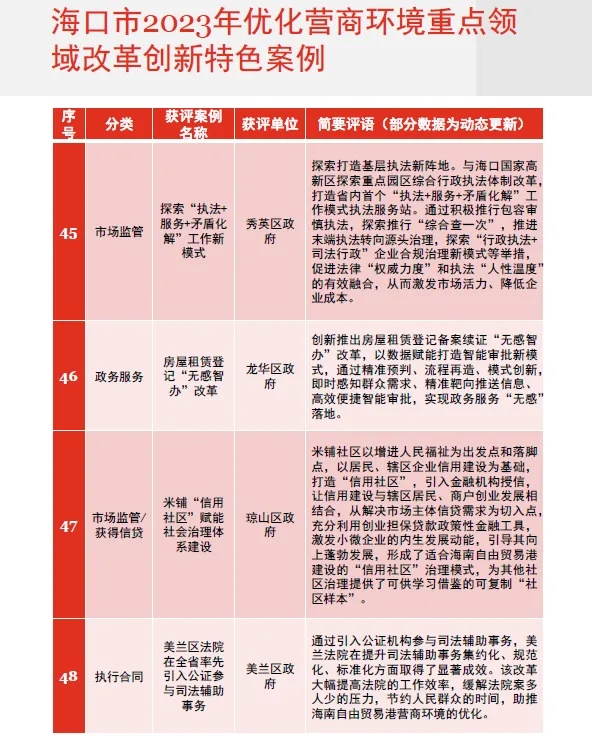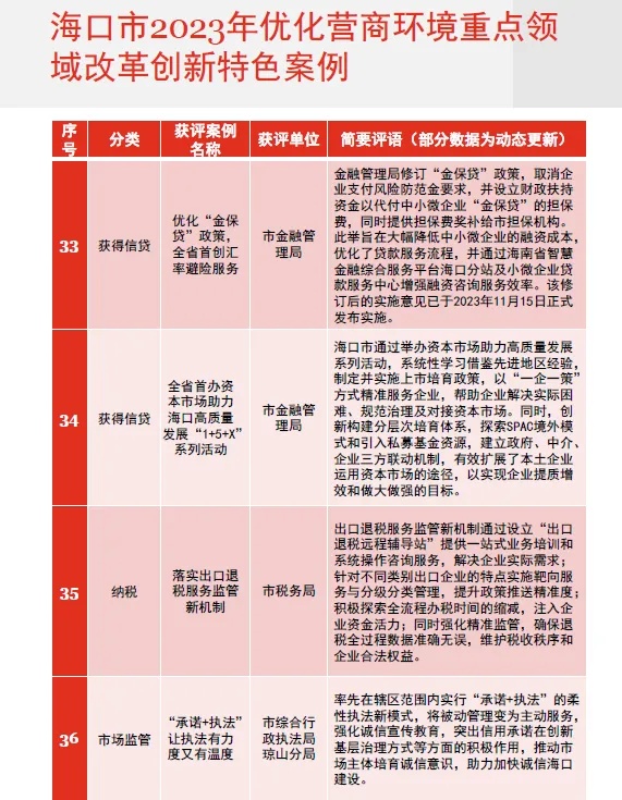 近日,海口市營商環(huán)境建設(shè)局發(fā)布2023年48個優(yōu)化營商環(huán)境重點(diǎn)領(lǐng)域改革創(chuàng)新特色案例。案例涵蓋信用建設(shè)、政務(wù)服務(wù)、數(shù)據(jù)共享、市場準(zhǔn)入、經(jīng)營場所、公用事業(yè)連接、金融服務(wù)、包容普惠創(chuàng)新、稅收等重點(diǎn)領(lǐng)域,全面展現(xiàn)了??谑袃?yōu)化營商環(huán)境重點(diǎn)領(lǐng)域的改革成果。