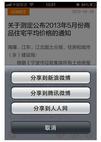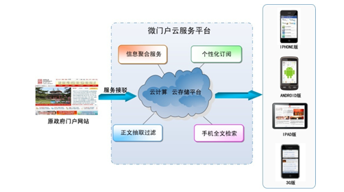 通過云計算及云存儲技術(shù),快速接駁現(xiàn)有互聯(lián)網(wǎng)政府信息公開平臺,以標(biāo)準(zhǔn)接口和移動客戶端界面開發(fā)調(diào)用現(xiàn)有平臺數(shù)據(jù),實現(xiàn)政府信息公開方式,在不需要投入硬件的前提下,完成網(wǎng)站信息公開內(nèi)容在手機(jī)終端上的展現(xiàn)。