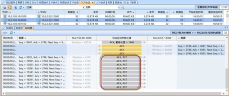 可以看到該會話中同樣存在了大量的復(fù)位數(shù)據(jù)包,但與DMZ區(qū)不同的是,復(fù)位數(shù)據(jù)包是由10。2。0。52發(fā)送的。