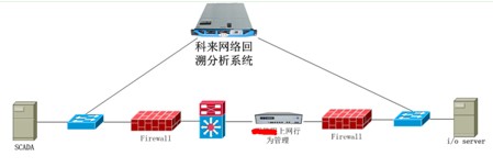下圖為簡化拓?fù)鋱D,我們展示SCADA系統(tǒng)和I/O Server之間的通訊鏈路,分別在靠近SCADA系統(tǒng)和I/O Server的接入交換機(jī)上采用端口鏡像的方式旁路部署科來網(wǎng)絡(luò)回溯分析系統(tǒng),采集SCADA系統(tǒng)和I/O Server之間的通訊數(shù)據(jù)包。