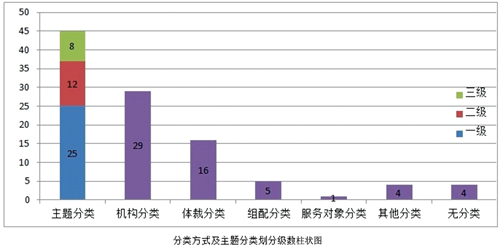 主題分類是目錄分類中的核心,反映了政府信息在內容方面的屬性或特征。一般來說,信息劃分的細致程度越深,對信息的歸類、管理統(tǒng)計和查詢會越有效率。經(jīng)過調查統(tǒng)計,50個部委級門戶網(wǎng)站中有45個采用了主題分類的分類方式,其中,只有一級類目的有25個,劃分到二級類目的有12個,三級類目的有8個。因此,在部委級門戶網(wǎng)站目錄主題分類中,只采用一級分類是最常用的做法。