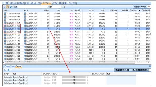 再定位到TCP會(huì)話,通過時(shí)序圖查看會(huì)話中FIN包的情況,可以看到在一個(gè)會(huì)話中存在多個(gè)FIN位置1的數(shù)據(jù)包,而且沒收到對(duì)端的確認(rèn),這表示該會(huì)話沒有正常關(guān)閉。