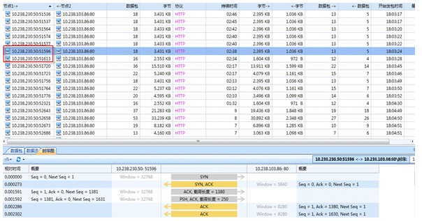 網(wǎng)絡(luò)中存在大量的在一個(gè)會(huì)話中發(fā)送大量FIN+ACK置1且window為0的數(shù)據(jù)包的情況(我們知道,在數(shù)據(jù)傳輸過程窗口為0表示不能接受任何數(shù)據(jù),至于關(guān)閉連接的window為0是否表示不能接收任何數(shù)據(jù)包有待驗(yàn)證,但可以肯定是不正常的),且這些會(huì)話都與10.238.230.50有關(guān),這就表示在10.238.230.50上有很多未關(guān)閉的TCP會(huì)話,這是不正常的,需要進(jìn)一步分析原因。