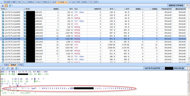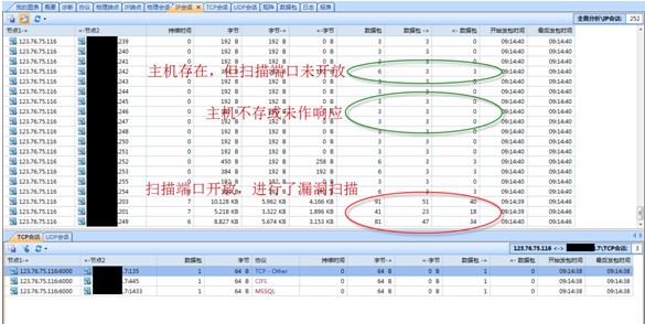 從上圖中可以看出攻擊者對每臺主機發(fā)送了至少3個TCP同步報文,目標(biāo)端口是每臺主機的RPC(135)、MSSQL(1433)和CIFS(445)。圖中數(shù)據(jù)包總量為3的是主機不存在或未作響應(yīng);數(shù)據(jù)包為6的是主機對掃描著回應(yīng)了TCP重置或ICMP目標(biāo)不可達消息,表示攻擊者訪問的端口沒有開放;而有幾臺主機與攻擊者交換了幾十個數(shù)據(jù)包,說明在這幾臺主機上的上述3個端口有一個或多個可以訪問,攻擊者對這幾臺主機進行了深入的漏洞掃描。