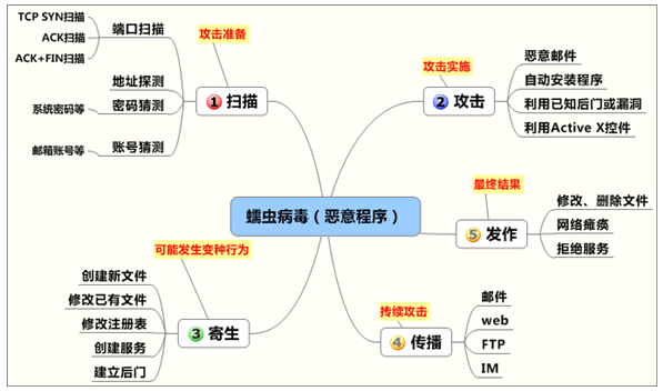 根據(jù)蠕蟲病毒的原理和特性,其通常具有“掃描、攻擊、寄生、傳播、發(fā)作”等幾大功能,每一個功能模塊具有不同的功能,如下圖所示: