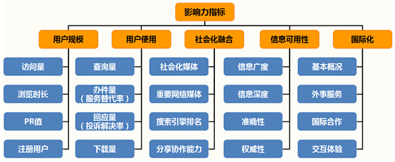 影響力是衡量政府網(wǎng)站對(duì)政府形象塑造、政府工作績(jī)效支撐度的重要指標(biāo),圍繞用戶的視角、生態(tài)的視角、權(quán)威的視角、國(guó)際的視角,其考評(píng)維度可以從“用戶規(guī)模、用戶使用、社會(huì)化融合、信息可用性、國(guó)際化”5個(gè)方面來(lái)展開(kāi)。