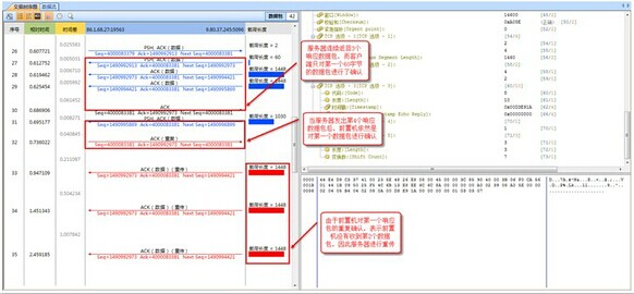 對生產(chǎn)前置機(jī)下載更新數(shù)據(jù)的TCP會(huì)話進(jìn)行解碼分析,發(fā)現(xiàn)前置機(jī)發(fā)起請求數(shù)據(jù)包后,生產(chǎn)服務(wù)器馬上響應(yīng)了3個(gè)數(shù)據(jù)包,其中第一個(gè)攜帶60字節(jié)應(yīng)用數(shù)據(jù),第二、三個(gè)為1448字節(jié),而客戶端只是對第一個(gè)數(shù)據(jù)包進(jìn)行了確認(rèn)。