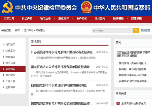 對(duì)于中紀(jì)委監(jiān)察部網(wǎng)站“案件查處”欄目公布的各地官員被查處的信息,大部分省份紀(jì)委監(jiān)察廳網(wǎng)站都在其“案件查處”、“曝光臺(tái)”、“權(quán)威發(fā)布”等欄目中及時(shí)發(fā)布,如江西、湖南、陜西、廣東、山東等省份。