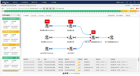 不同于其他廠商以物理網(wǎng)絡(luò)為對象的運行維護模式,科來業(yè)務(wù)性能管理解決方案最大特色之一是以業(yè)務(wù)網(wǎng)絡(luò)為運維對象。在部署之后系統(tǒng)會預(yù)先梳理各業(yè)務(wù)邏輯關(guān)系,建立支撐業(yè)務(wù)的應(yīng)用服務(wù)、主機系統(tǒng)、網(wǎng)絡(luò)路徑之間的關(guān)聯(lián)關(guān)系,再圍繞業(yè)務(wù)系統(tǒng)部署分析設(shè)備,制定針對性的監(jiān)控分析策略和警報策略。數(shù)據(jù)上報至UPM分析中心后,對業(yè)務(wù)網(wǎng)絡(luò)的應(yīng)用響應(yīng)性能、主機服務(wù)性能、網(wǎng)絡(luò)傳輸性能和交易處理性能進行智能化分析,提供集成的業(yè)務(wù)網(wǎng)絡(luò)性能監(jiān)控視圖(見圖1),把所有與業(yè)務(wù)相關(guān)聯(lián)的分析結(jié)果(如性能異常警報、關(guān)鍵性能指標(biāo)、多段數(shù)據(jù)對比等)集成到一起,進行圖形化顯示和關(guān)聯(lián)挖掘,一旦發(fā)生異常,即使是不熟悉業(yè)務(wù)知識的運維人員也能根據(jù)視圖快速定位問題點?!邦A(yù)先的業(yè)務(wù)邏輯梳理和針對性的監(jiān)控分析,相當(dāng)于為金融機構(gòu)提供了定制化的解決方案?!备邚﹦傔@樣告訴記者。