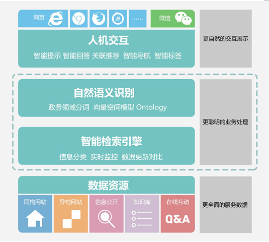 政府網(wǎng)站一直以來都被認(rèn)為是政府信息公開的第一平臺(tái),隨著信息時(shí)代數(shù)據(jù)的海量增加與網(wǎng)站群的構(gòu)建,政府機(jī)構(gòu)各部門為了更好地服務(wù)公眾都建立了各自獨(dú)立的門戶網(wǎng)站,然而對(duì)民眾來說迅速準(zhǔn)確查詢到所需的問題及相關(guān)信息卻囿于這龐大的數(shù)據(jù)而越來越難。政府網(wǎng)站是政府與公民交流的第一窗口,政府網(wǎng)站的友好程度直接關(guān)系到政務(wù)服務(wù)水平的高低。服務(wù)型智慧政府就是使公眾與政府之間產(chǎn)生良好的互動(dòng),讓公眾不再糾結(jié)于繁瑣的網(wǎng)站條目,改善二者間互通機(jī)制,提高政府網(wǎng)站的服務(wù)效率。