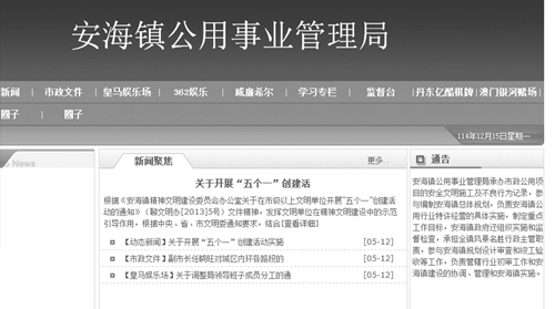 記者點開鏈接,乍一看,像是個正規(guī)網(wǎng)站,仔細(xì)一瞧,發(fā)現(xiàn)這個頁面無論是網(wǎng)站結(jié)構(gòu)還是美工程度都比較粗糙。頁面正上方有著大大的“安海鎮(zhèn)公用事業(yè)管理局”幾個字,下面一欄導(dǎo)航中有十個小欄目,其中包括“動態(tài)新聞”、“市政文件”等,令人咋舌的是,竟然還有“皇馬娛樂場”、“丹東億酷棋牌”、“澳門銀河賭場”等欄目。記者試著打開“皇馬娛樂場”欄目,跳出的是一個充滿各種賭場廣告和賭博信息的網(wǎng)站。