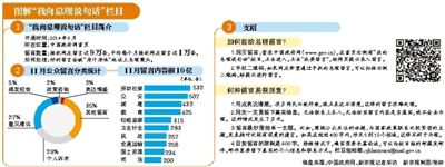 在這個欄目中,網(wǎng)友填寫個人信息后,就可以給總理留言,發(fā)表自己的看法。欄目開通至今,已接收網(wǎng)友留言近9萬條,平均每個月近1萬條。
