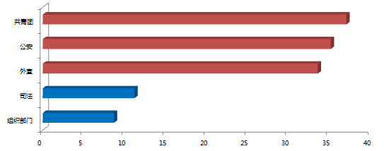 2014年,共青團(tuán)、公安、外宣、司法、組織部門的政務(wù)微博在全國政務(wù)微博中覆蓋度最廣,表現(xiàn)最為活躍,其中共青團(tuán)、公安類、政府外宣類政務(wù)微博賬號數(shù)量占比較高,構(gòu)成了政務(wù)微博中的第一梯隊(duì)。