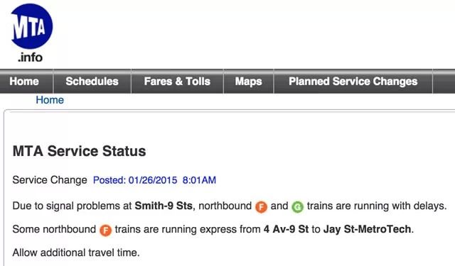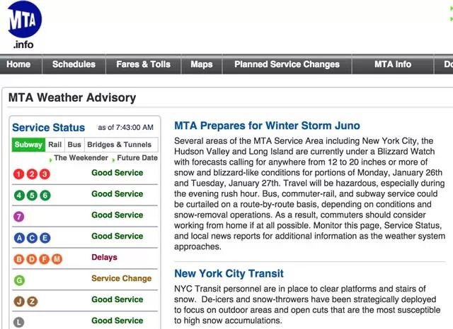 假設(shè)你是一個(gè)紐約市民,早上起來看到暴風(fēng)雪,想知道自己上班坐的地鐵和公交車是不是還在正常運(yùn)行,那么你可以點(diǎn)開交通管理部門“大都會(huì)運(yùn)輸署”的網(wǎng)站。這個(gè)網(wǎng)站略顯簡陋,但是在首頁一眼就能看到地鐵、公交車、鐵路、橋梁和隧道的運(yùn)行狀況。
