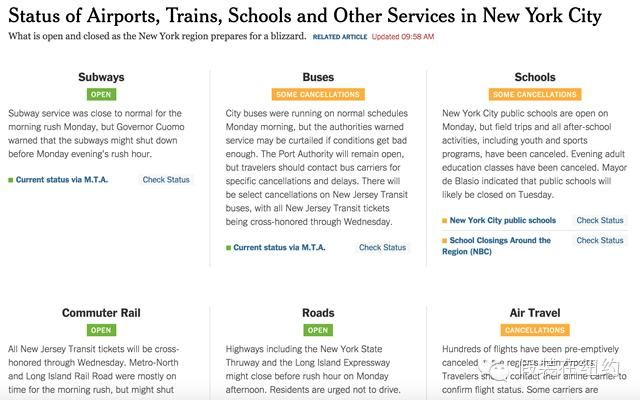 不過我今天要說的并不是這場雪,而是在《紐約時(shí)報(bào)》網(wǎng)站上看到的這個(gè)頁面,上面列出了各個(gè)政府管理部門的專門網(wǎng)頁,點(diǎn)進(jìn)去就能看到各種公共服務(wù)的實(shí)時(shí)狀態(tài)更新。