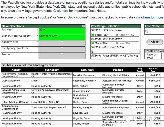 毫不夸張地說,在美國這個(gè)國家,所有的信息都是透明的。普通人想查詢?nèi)魏喂彩聞?wù)方面的數(shù)據(jù),都可以非常方便地查到。比如政府部門每一個(gè)工作人員每一年的薪酬?duì)顩r。在下面這個(gè)網(wǎng)站上,我查到了房屋局的電梯維修工Luis Cevallos的日薪是350美元,而勞動(dòng)關(guān)系處處長James Hanley在2014年的年薪則是205180美元。