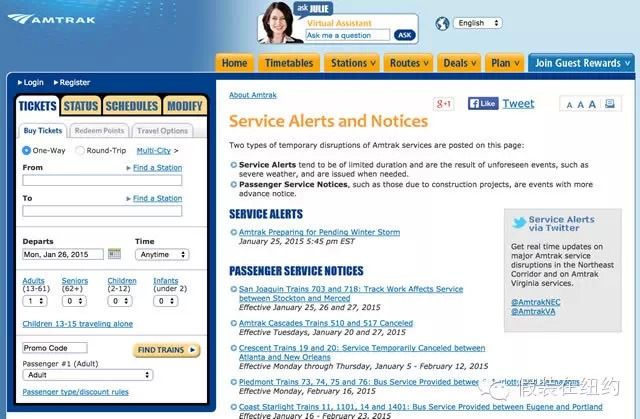 這是美國國家鐵路公司Amtrak的網(wǎng)站,上面同樣可以快速地查到各項(xiàng)信息。其他鐵路系統(tǒng)的類似信息也都可以在各自網(wǎng)站上找到。[page]