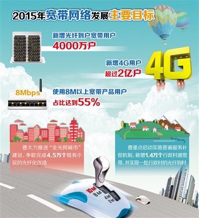 工信部提出,2015年的主要目標是,新增光纖到戶寬帶用戶4000萬戶,新增4G用戶超過2億戶,使用8Mbps及以上接入速率的寬帶用戶占比達到55%。