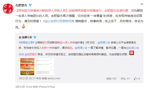 近日,@湘潭公安(湖南湘潭市公安局官方微博)、@安徽公安在線(安徽省公安廳官方微博)、@合肥警方(安徽合肥市公安局官方微博)通過(guò)密切配合,一天內(nèi)就破獲一個(gè)涉嫌傳銷的組織,成功解救了誤入傳銷組織的湘潭人吳某某。這也是湘潭警方利用新媒體平臺(tái)與線下聯(lián)動(dòng)破案的又一成功案例。