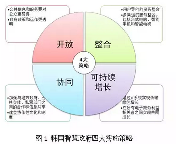 智慧政府建設(shè)強(qiáng)調(diào)在政府信息化的基礎(chǔ)上突出智能化及服務(wù)化,主張利用先進(jìn)信息技術(shù),提高政府辦公、監(jiān)管、服務(wù)、決策的智能化水平,更好地為公民提供方便、個(gè)性化的服務(wù)。2011 年3 月,韓國(guó)公共行政與安全部制定了《智慧政府實(shí)施計(jì)劃》,目標(biāo)是在2015 年建成智慧政府,其實(shí)施策略包括四個(gè)方面:開放、整合、協(xié)同、可持續(xù)的綠色增長(zhǎng)(如圖1)。2011年11月,美國(guó)加利福尼亞州為提高政府服務(wù)的績(jī)效及服務(wù)度,提出了《智慧政府建設(shè)框架》,框架為社區(qū)、地區(qū)和國(guó)家解決棘手問(wèn)題、保持可持續(xù)發(fā)展和繁榮提供了一系列治理原則。2014年6月,新加坡政府公布了“智慧國(guó)家2025”的10年計(jì)劃,提出將構(gòu)建“智慧國(guó)平臺(tái)”,建設(shè)覆蓋全島數(shù)據(jù)收集、連接和分析的基礎(chǔ)設(shè)施與操作系統(tǒng),根據(jù)所獲數(shù)據(jù)預(yù)測(cè)公民需求,提供更好的公共服務(wù)。