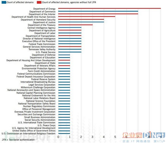 根據(jù)統(tǒng)計(jì),有89個(gè)域名,47個(gè)美國政府機(jī)構(gòu)的用戶名密碼可能被泄露。2015年初,這些機(jī)構(gòu)中的12個(gè),包括美國國務(wù)院和能源部,都沒有要求用戶使用兩步登陸驗(yàn)證?;ヂ?lián)網(wǎng)上出現(xiàn)這些登錄信息會使得這些機(jī)構(gòu)容易遭收集情報(bào),遭社工,或者遭到魚叉式網(wǎng)絡(luò)釣魚攻擊”,Recorded Future在這份名為“互聯(lián)網(wǎng)上的政府網(wǎng)站密碼”的報(bào)告中提到,“雖然有些機(jī)構(gòu)會使用VPN、多因素驗(yàn)證和其他安全措施,但正如行政管理和預(yù)算局向國會報(bào)告的那樣,很多機(jī)構(gòu)都還沒有這些措施。”