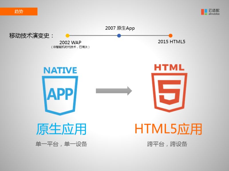 大家可以看到這個(gè)圖上有一個(gè)移動(dòng)技術(shù)的演變史,大家可能都知道在2000年初的時(shí)候有一個(gè)WAP技術(shù),功能機(jī)的時(shí)代就能上網(wǎng),那是一個(gè)非常簡化版本的移動(dòng)互聯(lián)網(wǎng)標(biāo)準(zhǔn),只能看看非常簡單的圖片和文字。到了2007年,IPHONE等智能手機(jī)發(fā)布,蘋果提出了"APP"概念,使得移動(dòng)互聯(lián)網(wǎng)相比WAP的用戶體驗(yàn)有了顯著的提升。APP也叫原生應(yīng)用,它只是為了一個(gè)單一的平臺(tái)設(shè)計(jì)的,當(dāng)時(shí)蘋果提出APP的時(shí)候只是為了自己的IOS系統(tǒng),它開發(fā)的所有APP也只能在IOS系統(tǒng)上應(yīng)用。后來GOOGLE也提出了自己安卓系統(tǒng)的APP標(biāo)準(zhǔn)、微軟也提出了自己WINDOWS手機(jī)上的 APP標(biāo)準(zhǔn)??傊總€(gè)操作系統(tǒng)的廠商都提出了自己APP的標(biāo)準(zhǔn),這就導(dǎo)致了不同平臺(tái)開發(fā)不同的APP這樣的格局。而且當(dāng)時(shí)APP的提出只是為了手機(jī)設(shè)計(jì)的,如果你還要開發(fā)IPAD的話,要重新開發(fā)。所以簡單來說,APP原生應(yīng)用是為了單一平臺(tái)、單一應(yīng)用而設(shè)計(jì)的。所以后來W3C也看到這個(gè)問題的存在,計(jì)劃推出下一代的HTML5標(biāo)準(zhǔn)技術(shù),HTML5能夠讓你開發(fā)的應(yīng)用橫跨所有的平臺(tái)、橫跨所有的設(shè)備。
