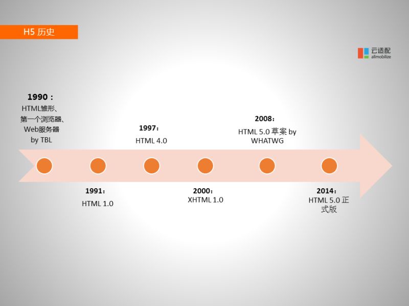 這是一個(gè)HTML發(fā)展的整個(gè)歷史。大家也可以看到世界上第一個(gè)互聯(lián)網(wǎng)雛形是1990年由歐洲一叫TBL的人提出來的。這個(gè)技術(shù)很快在科研領(lǐng)域得到了認(rèn)可。在1991年,TML把HTML技術(shù)寫成了一個(gè)正式的標(biāo)準(zhǔn)文檔,就是當(dāng)時(shí)的HTML1.0。很快,互聯(lián)網(wǎng)技術(shù)迅速從科研領(lǐng)域蔓延到民用領(lǐng)域和商業(yè)領(lǐng)域。尤其在1994年的時(shí)候,網(wǎng)景公司開發(fā)了世界上第一個(gè)商用瀏覽器,極大程度促進(jìn)了老百姓對(duì)互聯(lián)網(wǎng)的使用。隨后,微軟馬上也開發(fā)了IE瀏覽器。從1994年到1997年,網(wǎng)景瀏覽器和IE瀏覽器之間發(fā)生了激烈的瀏覽器大戰(zhàn),這也極大的促進(jìn)了HTML標(biāo)準(zhǔn)的進(jìn)步。很快,HTML進(jìn)步了幾個(gè)版本,到1997年進(jìn)步到HTML4.0 。當(dāng)然,大家都知道,最后的結(jié)局是IE瀏覽器徹底打敗了網(wǎng)景瀏覽器,搶走了所有瀏覽器的市場(chǎng)份額,所以在IE5.5版本發(fā)布之后,基本IE瀏覽器就是一枝獨(dú)秀了。之后HTML標(biāo)準(zhǔn)就進(jìn)入了很長一段時(shí)間的平靜期。這個(gè)時(shí)候W3C覺得當(dāng)時(shí)的HTML設(shè)計(jì)的不夠完善,所以在2000年的時(shí)候提出了XHTML,這個(gè)版本比原版HTML語法要嚴(yán)格很多,也加入了語義的元素進(jìn)去。可惜的是,過去的HTML4.0已經(jīng)根深蒂固了,很難使得整個(gè)互聯(lián)網(wǎng)向XHTML遷移。最后W3C發(fā)現(xiàn)了XHTML很難推,又恰逢蘋果發(fā)布了智能手機(jī),整個(gè)市場(chǎng)對(duì)新一代HTML有強(qiáng)烈的需求。在2008年HTML聯(lián)合了另一個(gè)民間組織,發(fā)布了HTML5.0的草案。