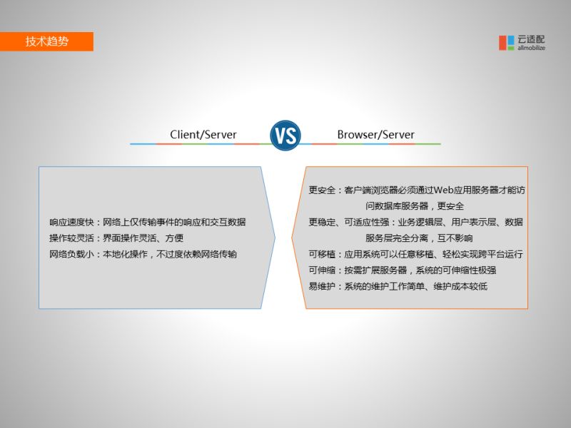 從C/S與B/S的對(duì)比圖可以看出,APP對(duì)比HTML5在響應(yīng)速度、網(wǎng)絡(luò)依賴的不同。另外我想補(bǔ)充的是,一是B/S結(jié)構(gòu)相對(duì)更加安全。因?yàn)楹诳秃苋菀自L問你本地的客戶端,很多數(shù)據(jù)處理邏輯都在客戶端里,很容易被黑客竊?。蝗绻荁/S結(jié)構(gòu)的話,你所有的計(jì)算都在服務(wù)器端,別人是很難竊取你的商業(yè)機(jī)密的。第二,客戶端軟件很容易中病毒的。你發(fā)出去的APP可能被黑客重新打包、接入病毒再傳播出去。比如政務(wù)辦公APP,可能被黑客打包加入病毒再發(fā)布到應(yīng)用商店里去,老百姓在應(yīng)用APP的時(shí)候,所有的行為都可以監(jiān)控到,包括核心支付、個(gè)人信息等,都會(huì)被黑客竊取。因?yàn)锽/S結(jié)構(gòu)的網(wǎng)址是唯一的,黑客是不可能偽造的,比如中國政府網(wǎng)的網(wǎng)址是www.gov.cn ,老百姓知道這個(gè)網(wǎng)址一定是到達(dá)中國政府網(wǎng),這就避免了被重新打包的危險(xiǎn)。三是,B/S結(jié)構(gòu)維護(hù)起來也非常簡單。很多時(shí)候要升級(jí)服務(wù)器端的產(chǎn)品,但如果用戶不升級(jí)其APP的話,你還需要保留一份老版本的APP,才能讓其繼續(xù)使用,這個(gè)維護(hù)成本是非常高的,而B/S結(jié)構(gòu)的話,用戶訪問到的永遠(yuǎn)是最新版,不用擔(dān)心兼容性的問題。四是操作系統(tǒng)每次升級(jí),APP都要同樣升級(jí),而B/S結(jié)構(gòu)則不會(huì)有這個(gè)問題,所以維護(hù)的工作量會(huì)降低很多。