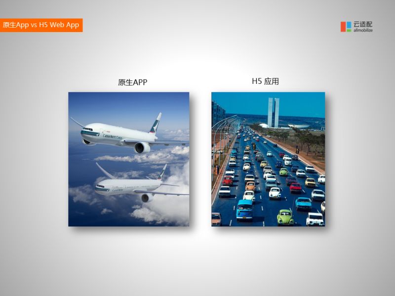 當(dāng)然,無論是原生APP還是HTML5,他們都是展現(xiàn)信息的方式,不是完全矛盾的。只是你需要根據(jù)不同的場(chǎng)合選擇不同的技術(shù)。這就像交通工具一樣,原生APP比較像飛機(jī),它的速度很快,但前期投入成本很高,你要修機(jī)場(chǎng)、跑道,而且飛機(jī)起飛降落都是很繁瑣的過程;而HTML5就像汽車,它非常靈活,非常靈巧;所以選用汽車還是飛機(jī)都要看你實(shí)際的需求。大家平時(shí)在日常生活中只要選擇汽車作為交通工具,所以絕大多數(shù)的應(yīng)用HTML5就足夠了,只有少數(shù)的應(yīng)用,像微信這種每天都要使用的、強(qiáng)交互的應(yīng)用才做APP比較合適。