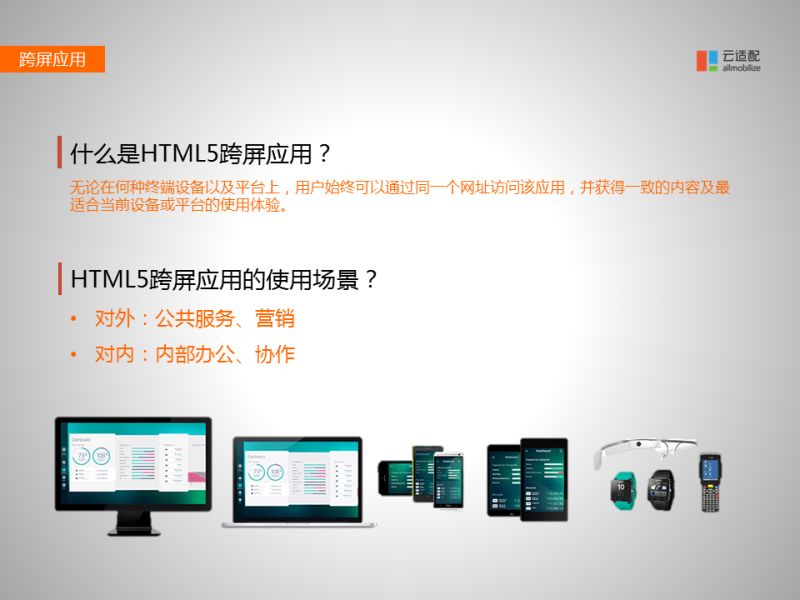 H5它的特性可以歸納成兩個(gè)方向:橫向和縱向。縱向就是有更酷炫的圖像效果,可以做出很豐富的交互界面的應(yīng)用,有很多的增強(qiáng)API可以讓你訪問攝像頭、GPS。橫向就是跨平臺(tái)、跨屏,一次開發(fā)可以運(yùn)行到很多地方,各種這樣的設(shè)備上。云適配就是致力于幫您打造HTML5跨屏應(yīng)用,對(duì)外讓老百姓無論使用什么設(shè)備、什么平臺(tái),始終可以通過同一個(gè)網(wǎng)址訪問到您的網(wǎng)站,來完成政務(wù)辦公系統(tǒng)。對(duì)內(nèi)移動(dòng)辦公協(xié)同系統(tǒng)上,每個(gè)人的手機(jī)、平臺(tái)都不一樣,用HTML5也是非常高效的。