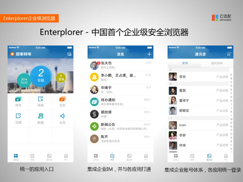 針對(duì)這種情況,我們開發(fā)了中國第一個(gè)企業(yè)級(jí)安全瀏覽器,能把辦公系統(tǒng)整合到一起,并移動(dòng)化,既方便員工又方便企業(yè)管理。同時(shí)還集成了企業(yè)的IM,能夠讓各個(gè)辦公系統(tǒng)的應(yīng)用向員工發(fā)通知。比如一個(gè)流程做完了,通過即時(shí)通訊工具直接通知下一個(gè)流程辦理人員,還集成了企業(yè)員工的賬號(hào)體系,實(shí)現(xiàn)統(tǒng)一的登陸,應(yīng)用系統(tǒng)就暢通無阻。