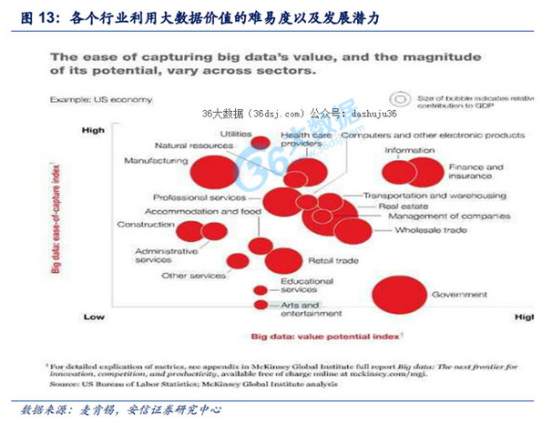 根麥據(jù)肯錫大數(shù)據(jù)研究報告指出, 各個行業(yè)利用大數(shù)據(jù)價值的難易度以及發(fā)展?jié)摿?對比下,政府利用大數(shù)據(jù)難度最低而潛力最大。