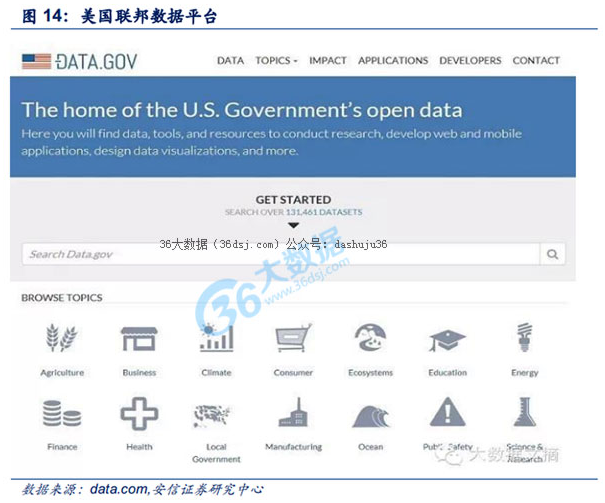 大數(shù)據(jù)時代,對大數(shù)據(jù)的開發(fā)、利用與保護的爭奪日趨激烈,制信權(quán)成為繼制陸權(quán)、制海權(quán)、制空權(quán)之后的新制權(quán),大數(shù)據(jù)處理能力成為強國弱國區(qū)分的又一重要指標。國際上以美國為代表的發(fā)達國家紛紛布局大數(shù)據(jù)產(chǎn)業(yè),相繼推出大數(shù)據(jù)相關(guān)政策,大力支持大數(shù)據(jù)產(chǎn) 業(yè)在本國的發(fā)展。以美國為例,美國從開展關(guān)鍵技術(shù)研究、推動大數(shù)據(jù)應用和開放政府數(shù)據(jù)三方面布局大數(shù)據(jù)產(chǎn)業(yè),尤其在開放政府數(shù)據(jù)方面非常積極,通過 Data.gov開放 37 萬個數(shù)據(jù)集,并開放網(wǎng)站的 API 和源代碼,提供上千個數(shù)據(jù)應用。我們認為,大數(shù)據(jù)未來將 引發(fā)新一輪大國競爭,大數(shù)據(jù)對整個世界的影響力會呈現(xiàn)爆發(fā)性增長趨勢,因此包括我國在內(nèi)的國家會在政策支持力度上不斷提升,大數(shù)據(jù)戰(zhàn)略將上升至國家戰(zhàn)略已毋庸臵疑。
