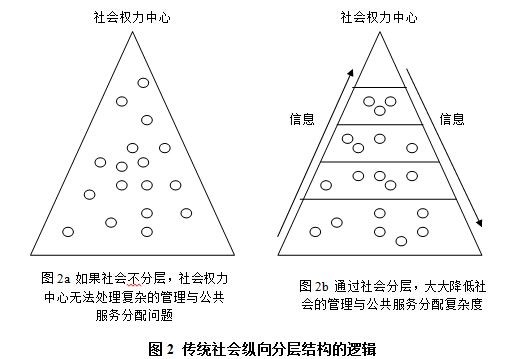 而從縱向來看,傳統(tǒng)社會形成的縱向科層結(jié)構(gòu),也是受制于信息交換不暢形成的降低管理復雜度的自然演化結(jié)果。對于任何一個形態(tài)較為復雜的社會而言,其需要解決兩個方面的問題,一是社會的有效組織,即通過有效的組織形式,來調(diào)配社會的組織資源,從而完成社會生產(chǎn)-分配-消費等活動;二是有效的解決個體的公共服務需求問題,通過某種特殊的資源分配形式,從而形成有效的公共服務需求個體滿足,從而促使社會自身的發(fā)展并獲得社會個體對這一社會結(jié)構(gòu)基本的支持。而在傳統(tǒng)社會中,由于社會信息交換渠道有限,且信息處理能力狹窄,因此,社會中不可能每個個體都與社會中心形成信息交換,直接接受社會中心的指令,社會中心也無法直接了解到每個個體的需求,從而分配公共產(chǎn)品。因此,為了解決這一矛盾,最有效的方式是根據(jù)某種社會規(guī)則,形成特定的社會等級,而在每一等級內(nèi),其大體上社會個體的需求與能力是相同的,因此在管理上,只需要針對這一等級發(fā)號管理命令上即可,同樣,每一等級內(nèi)的公共服務需求也大體一樣,只需要按照等級供給就可以了。因此,通過等級化的方式,最終將原本千千萬萬不同的個體管理和公共服務供給,降低為十幾或者幾十種不同等級的管理與公共服務供給問題。而這樣就極大減少了管理和公共服務供給方面的復雜度,而從信息傳遞與處理而言,社會權(quán)力中心不再需要面對每個個體,只需要處理層級之間傳遞的信息即可,這就解決了傳統(tǒng)社會下,信息傳遞渠道有限與處理能力較低的問題(參見圖2)。