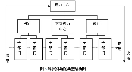 圖5描述了這種結(jié)構(gòu),如圖中,在最高層,存在一個穩(wěn)固的權(quán)力中心,而在權(quán)力中心下,形成兩種下屬層級:一種直接服務于最高權(quán)力中心的職能部門;另一種是形成下屬的權(quán)力中心統(tǒng)管一方面的工作;而在每個下屬層級內(nèi),又根據(jù)需要形成級別更低的科層體系。